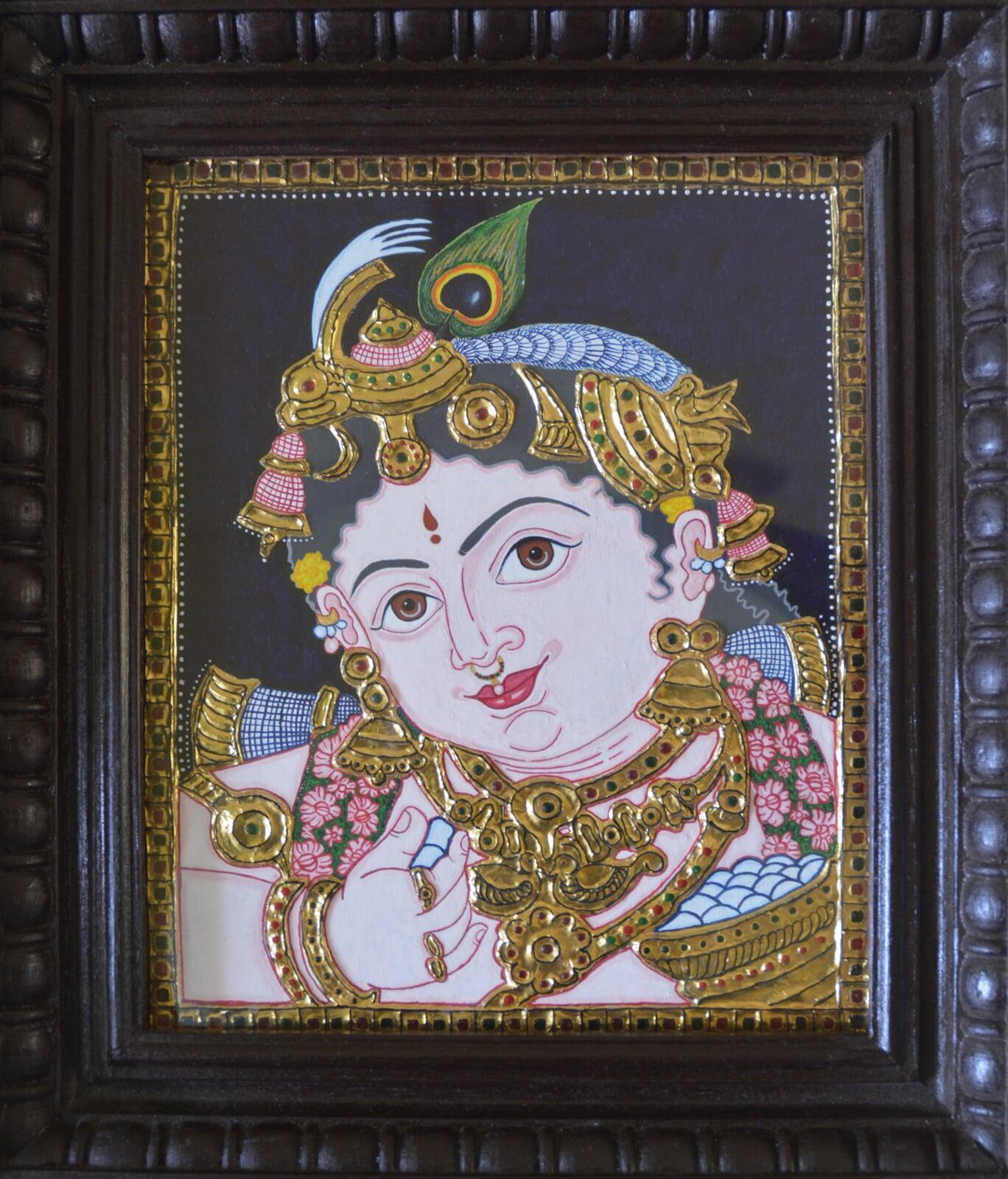 Thanjavur paintings are typically completed on boards made from jackfruit or teak wood. Common themes in paintings include Bal Krishna, Lord Rama, as well as other gods, goddesses, saints and subjects from Hindu mythology. The technique of painting demanded a great deal of perseverance and perfection from artists. Furthermore, the creation of the artwork, considered a sacred task, was to be performed with some degree of ritual purity and humility by the master craftsmen. Remaining true to the Indian artistic tradition, most artists chose to remain anonymous and never signed their paintings.